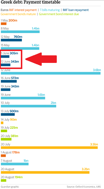 On May 15 Greece has to “roll over” €1.4B in debt, which means sell more debt to pay debt, or borrow money to pay money back. They can do that because the banks keep buying more T-Bills. What they can’t do is pay the IMF anymore. €305M on June 5. €343 a week later. There is no more money left in the IMF monopoly account at the IMF to pay the IMF back with. There’s nothing left.