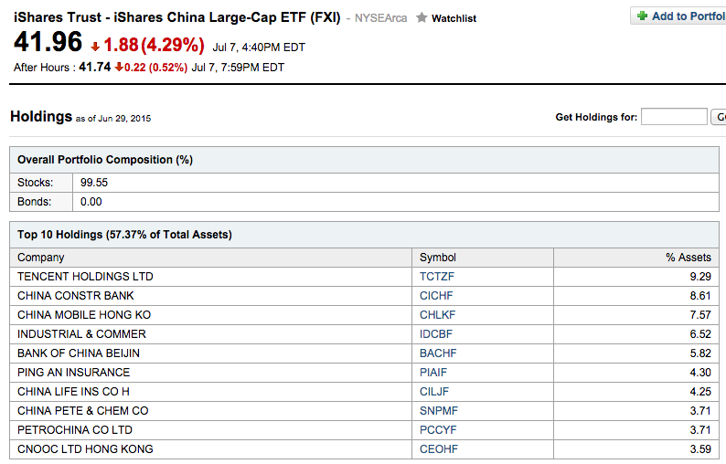 However, the American Depository Receipt (ADR) equivalents of Chinese stocks are still trading on the US exchanges. And they’re still going down. Here are the top ten holdings of the iShares China Large-Cap ETF, all still trading on American exchanges. China can’t shut those down.